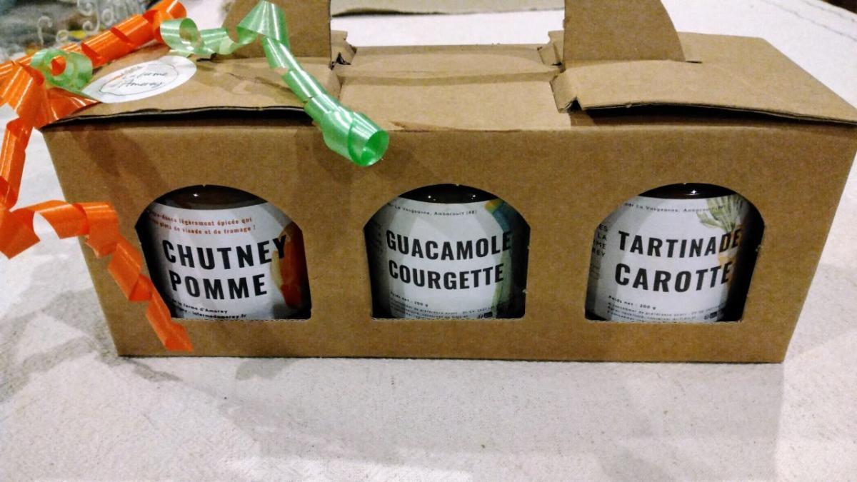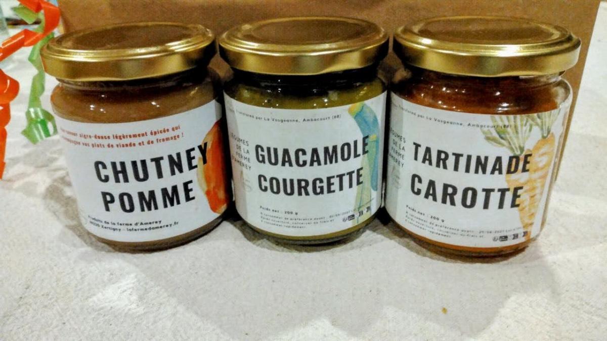 Trio de légumes en bocaux : chutney de pomme, guacamole de courgette et tartinade / ketchup de carotte
